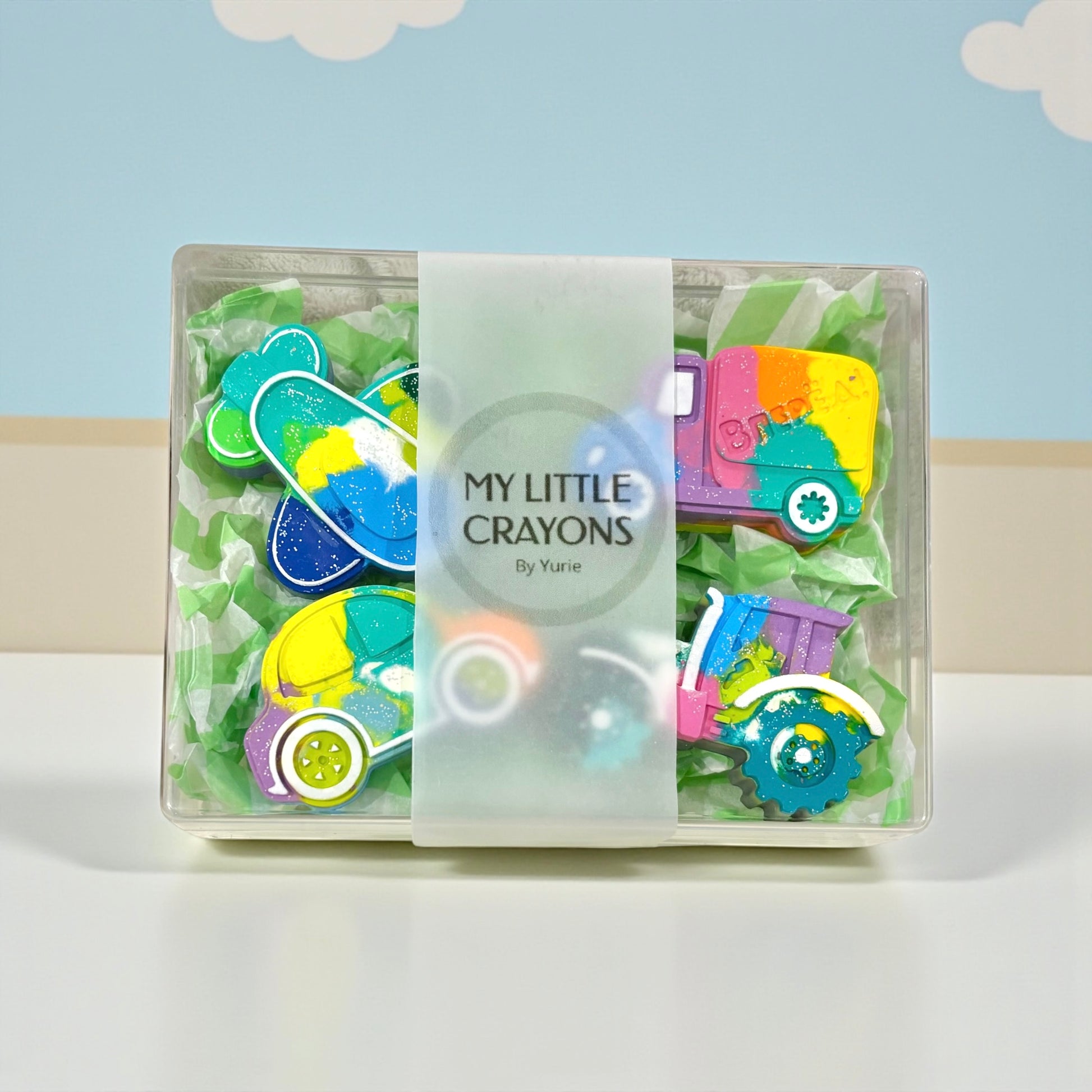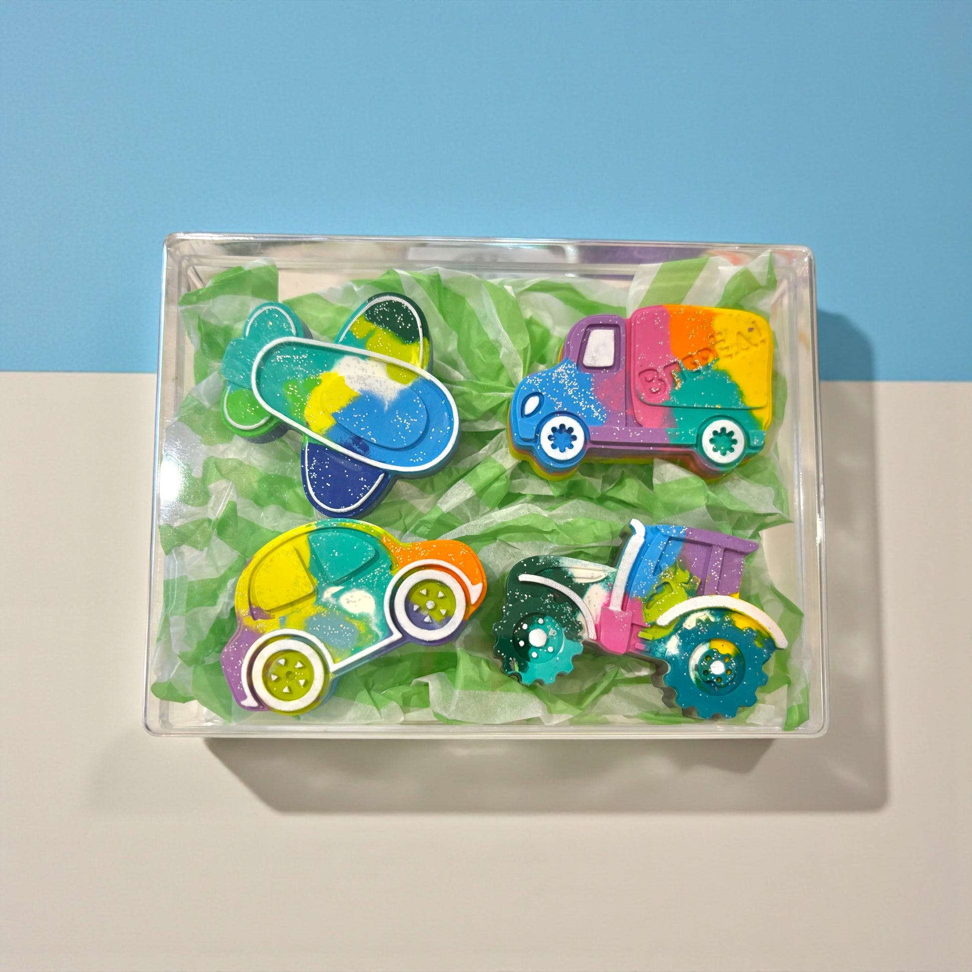 • 4 Handcrafted Vehicle Crayons: (e.g., Car, Plane, Truck, Train) in vibrant, marbled hues.