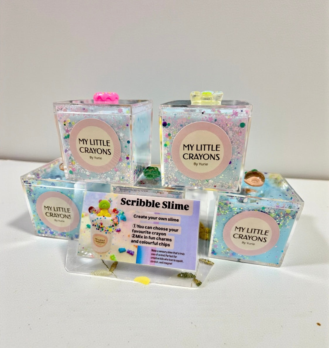 Please let me know if you have any colour preferences for the bear crayon and the slime.